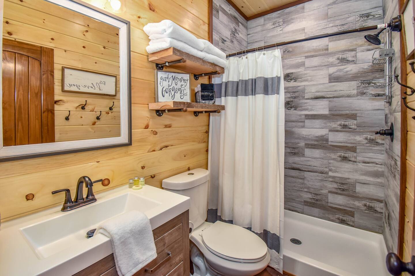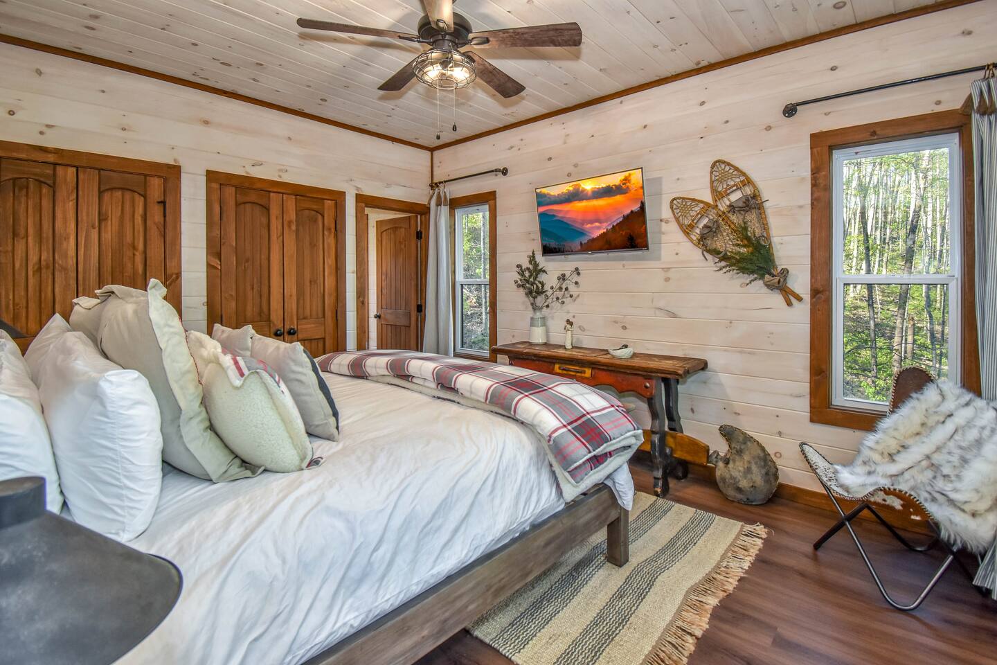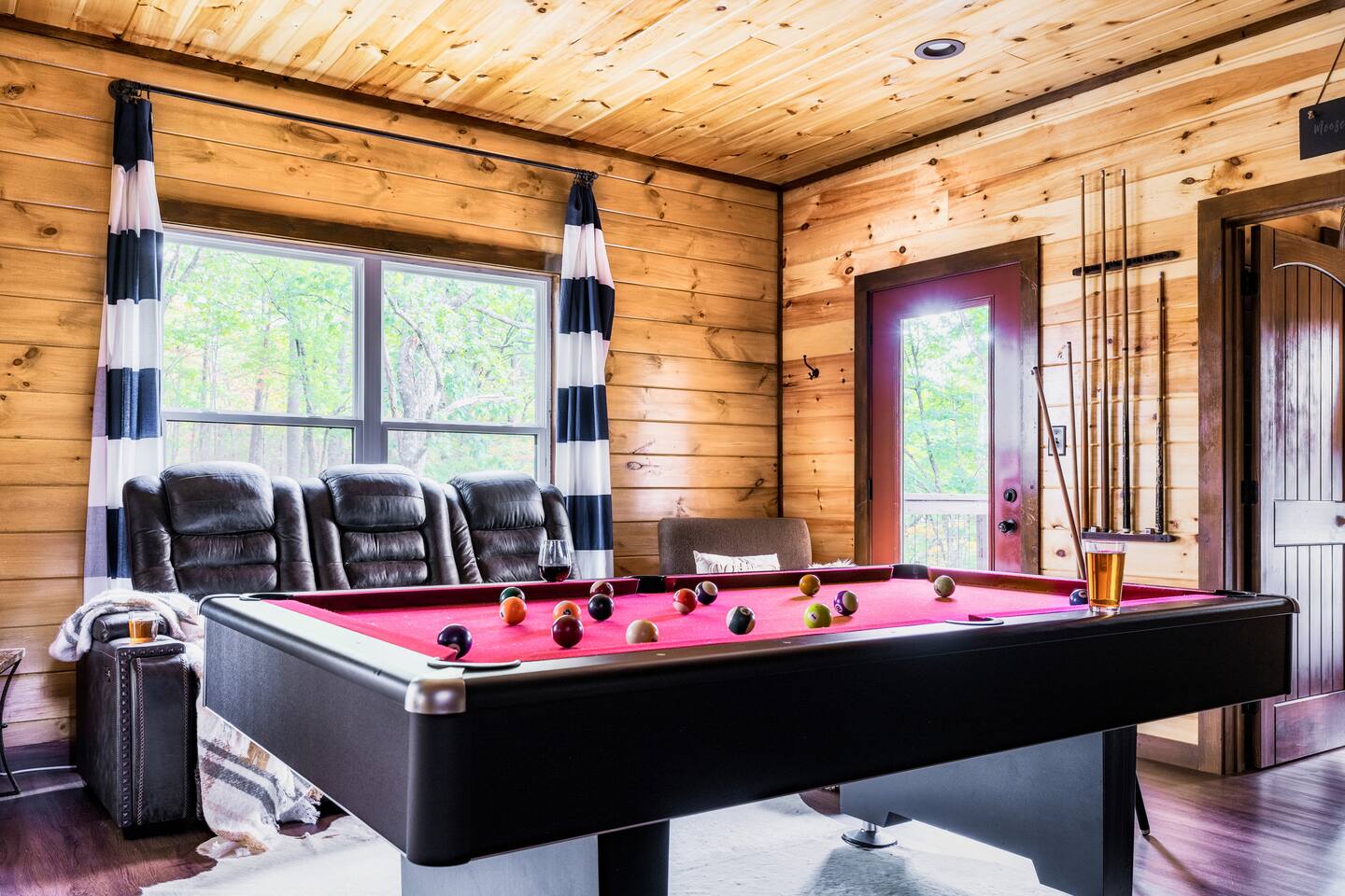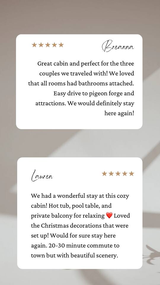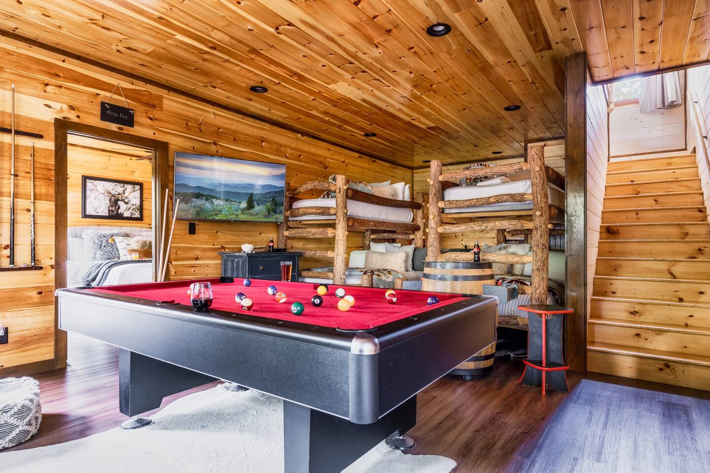 ** LIVING SPACE** Upon entering the cabin, you are greeted by a warm and inviting atmosphere. The interior is tastefully decorated with a perfect blend of modern comfort and rustic charm. The open concept living space features large windows allowing natural light to fill the room. Guests can relax and enjoy the luxurious reclaimed wood furnishings from Pottery Barn, West Elm, Restoration Hardware, Four Hands, and more! The space is complemented with a stone fireplace, creating a peaceful ambiance perfect for family gatherings. **BED & BATHS** This beautiful cabin offers 3 master king suites and a game/bunk room with 2 sets of twin over double bunk beds. Each master suites are thoughtfully designed to ensure a restful night's sleep. Soft linens and comfortable furnishings create a peaceful sanctuary for both adults and children. We accommodate up to 12 guests, with a max of 8 adults. All 3 suites include the following amenities. - king size bed with comfortable mattress and luxurious hotel quality linen - Smart 4k UHD HDR TV - Ceiling fan - Nightstand with alarm clock and USB ports - Private attached bath equipped with shower gel and shampoo ** HOT TUB** For moments of relaxation, step outside onto the expansive deck where you'll find a private hot tub. Immerse yourself in the warm, bubbling water while surrounded by the sounds of nature and the clean and crisp mountain air – a perfect way to unwind after a day of exploring the nearby hiking trails or enjoying the attractions of the Smoky Mountains. ** GAME/FAMILY ROOM ** This room is perfect for kids of all ages with numerous games and activities! - 55” Smart 4K UHD HDR TV - Pool Table - Arcade with 60 vintage games including PAC-Man, Donkey Kong, Galaga Centipede & 1942 - Board & Card Games ☆☆ PARKING ☆☆ Caution - Steep Driveway. The driveway is steep, but cars of all makes and models can be accommodated. We have parked everything from a small coupe to a large moving truck in the driveway without issue. 2-3 vehicles can park in the driveway. Additional parking for 1-2 vehicles is available in the level cul-de-sac at the road. Please don't block the road or neighboring driveways. ☆☆ OUTDOORS ☆☆ - Sit back and relax in one of the rocking chairs overlooking the forest below. - With almost a full acre, there’s plenty of room to explore. - Take a nap on the outdoor hanging bed! - Soak it up in the Hot Tub! - Reminisce and tell stories around the fire pit! - Play yard games like Giant Jenga or have a cornhole tournament! ☆☆ AMENITIES ☆☆ Our cleaning team provides startup supplies which includes hand soap, body wash, shampoo, conditioner, trash bags, paper towels, dish washer soap and toilet papers. Depending on the length of your trip, you may need to purchase additional items if the initial supply runs out. ☆☆ CLEANING FEE ☆☆ The only fee we charge is a cleaning fee. This fee goes directly to the family that cleans the property between each stay and is designed to be a Fair Living Wage. Between each stay the property is thoroughly cleaned and sanitized, and all towels and linens are replaced with fresh clean towels/linens that have been freshly laundered. ☆☆ WINTER ACCESS ☆☆ While it's very rare, during winter storm conditions 4WD and/or snow chains may be necessary to access the property. All roads leading to the property are paved. ☆☆ HIGH SPEED INTERNET WIFI ☆☆ High speed internet Wi-Fi is offered which supports multiple streaming devices. But because of the mountain region, sometimes there can be outages and we do not guarantee internet would be supported in such unfortunate circumstances. We are not responsible for internet outages or other conditions which are out of our control.